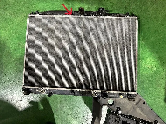 写真上側についている黒い部分がアッパータンクでシルバーになっている所の接合部分から冷却水がもれていました!(右側写真の赤色の矢印)